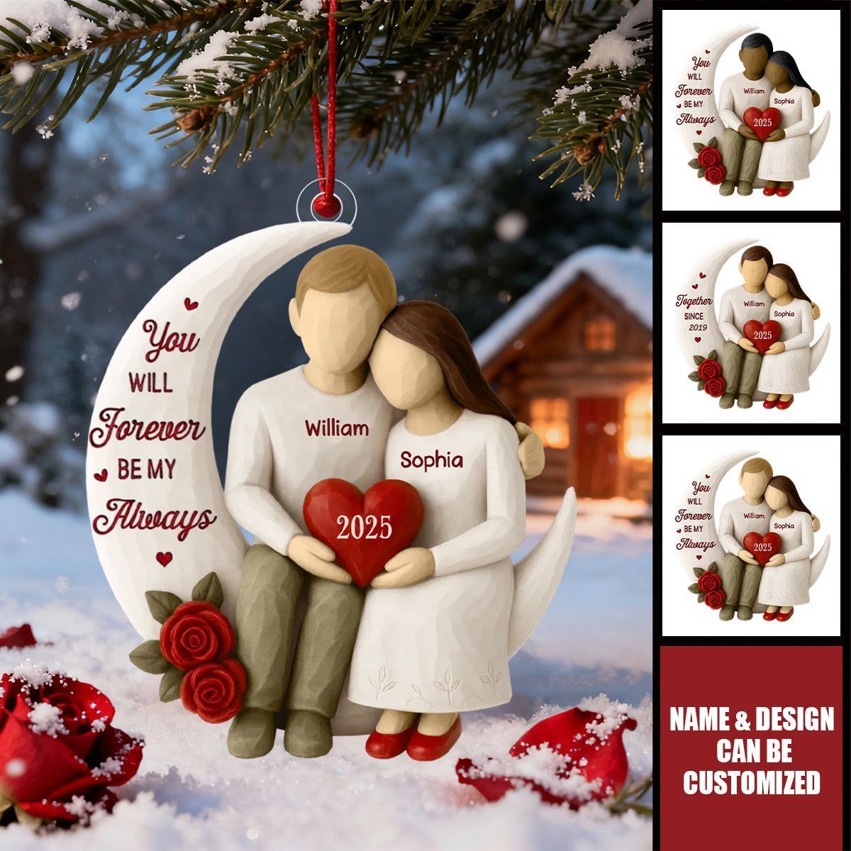 Roses Wooden Texture Couple On Moon - Personalized Acrylic Ornament - Christmas Gift For Couple